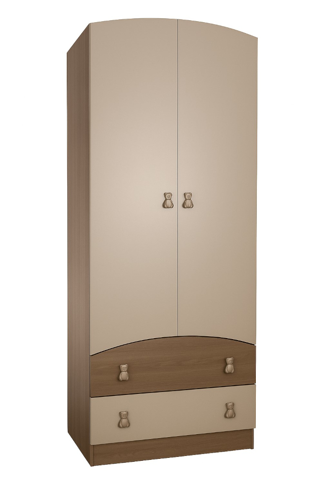 Ντουλάπα δίφυλλη premium με εσωτερικά ράφια από την μία πλευρά μεταλλική μπάρα για κρεμάστρες από την άλλη. Δύο μεγάλα συρτάρια στο κάτω μέρος. Είναι κατασκευασμένη από μελαμίνη και έχει μοντέρνο σχεδιασμό. Χερουλάκια αρκουδάκια από καουτσούκ