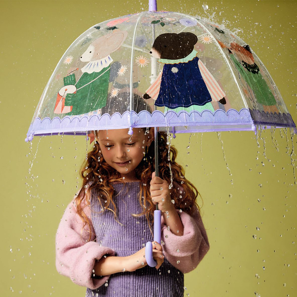 Η σειρά με τις διαφανείς ομπρέλες από την εταιρία Djeco ήρθε για να φωτίσει τις βροχερές μέρες του χρόνου. Το διάφανο PVC υλικό της ομπρέλας επιτρέπει στο παιδί να βλέπει και να παρατηρεί γύρω του και ο ψηλός θόλος της παρέχει μεγάλη προστασία από τις σταγόνες της βροχής. Το Fibreglass υλικό προσφέρει έναν γερό και ανθεκτικό σκελετό. Ο χειροκίνητος τρόπος ανοίγματός της προστατεύει τα δάχτυλα των μικρών μας φίλων. Τα πλαστικά καπάκια στις άκρες από τις ακτίνες, καθιστούν την ομπρέλα απόλυτα ασφαλή και κατάλληλη για παιδιά από 3 ετών και άνω. Η ιδιαίτερη εικονογράφησή της, θα τραβήξει την προσοχή του παιδιού από την πρώτη στιγμή. Διαστάσεις: 70 x 68 εκ.