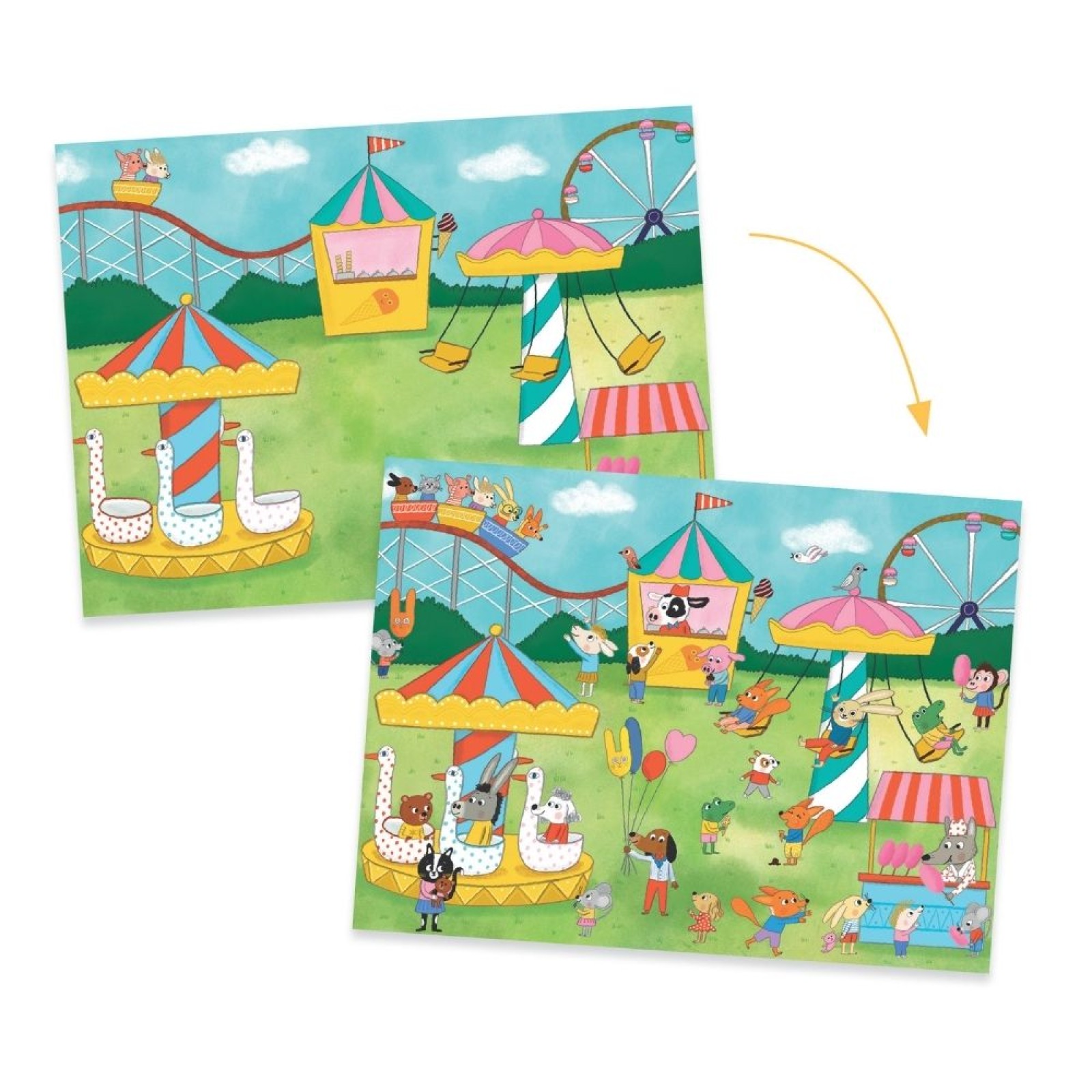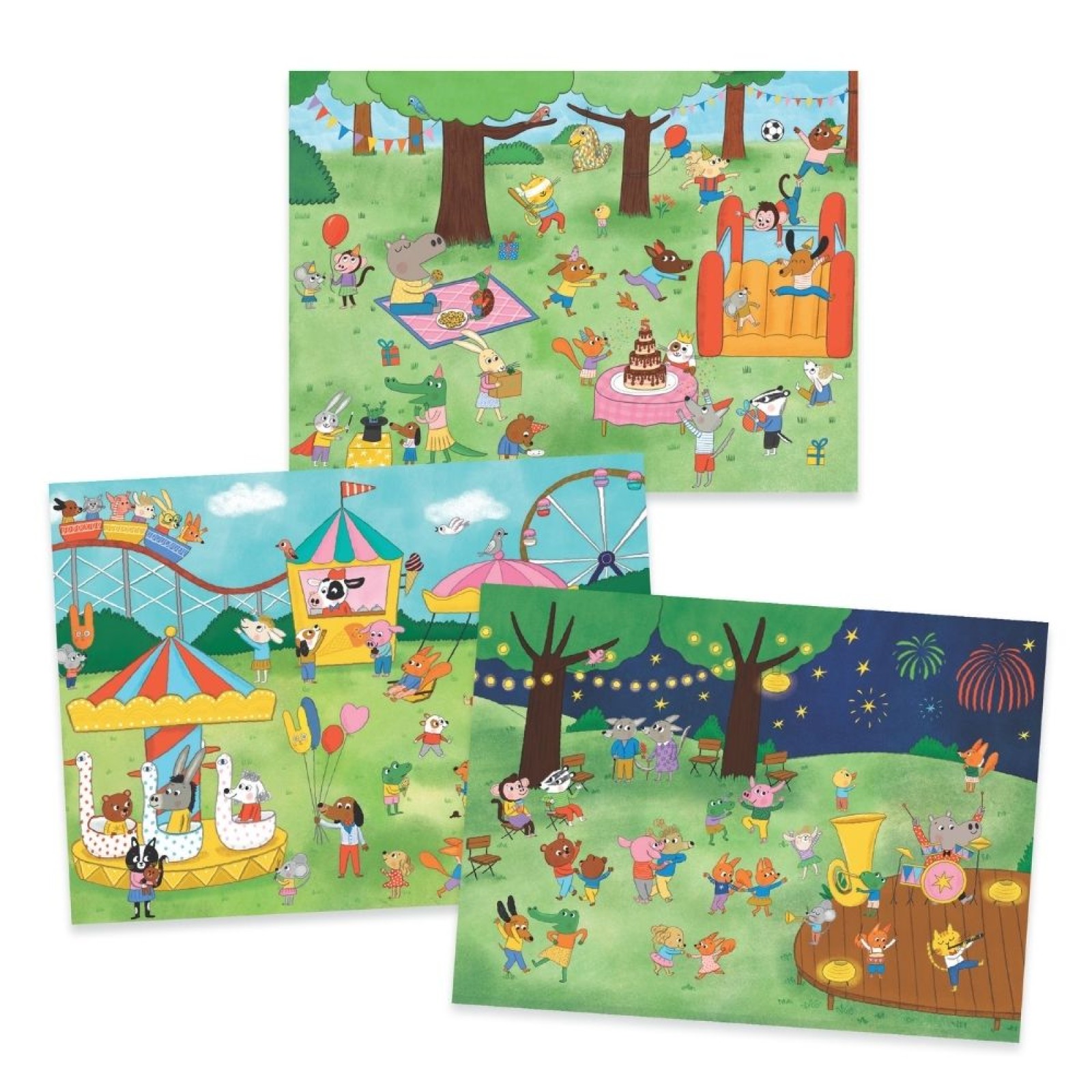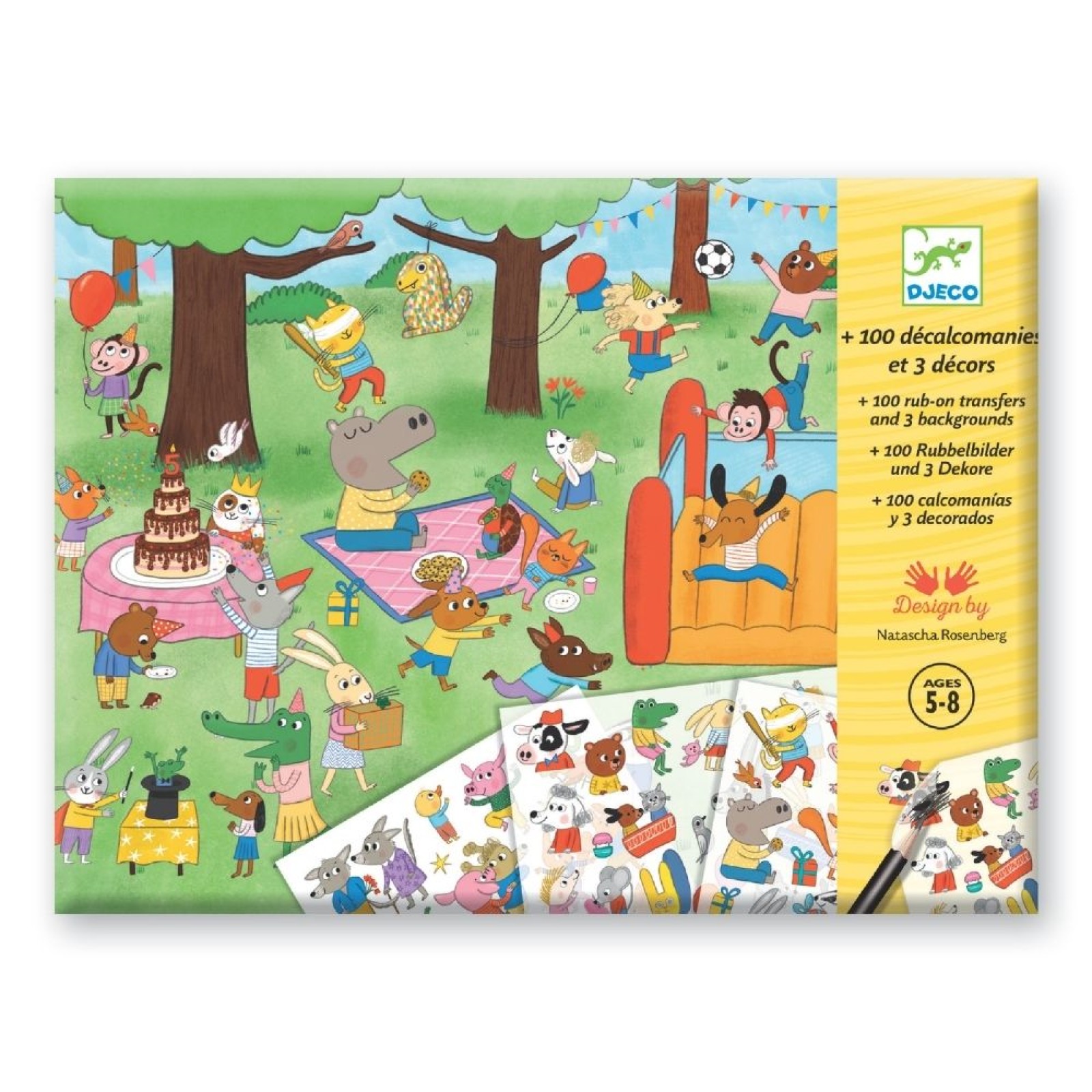 Χρησιμοποιήστε την φαντασία σας και τις χαλκομανίες της εταιρίας Djeco για να δημιουργήστε 3 ξεχωριστά σκηνικά με ζωάκια: ένα πάρτι στον κήπο, μια επίσκεψη στο λούνα παρκ ή ένα ξέφρενο βραδινό χορό!