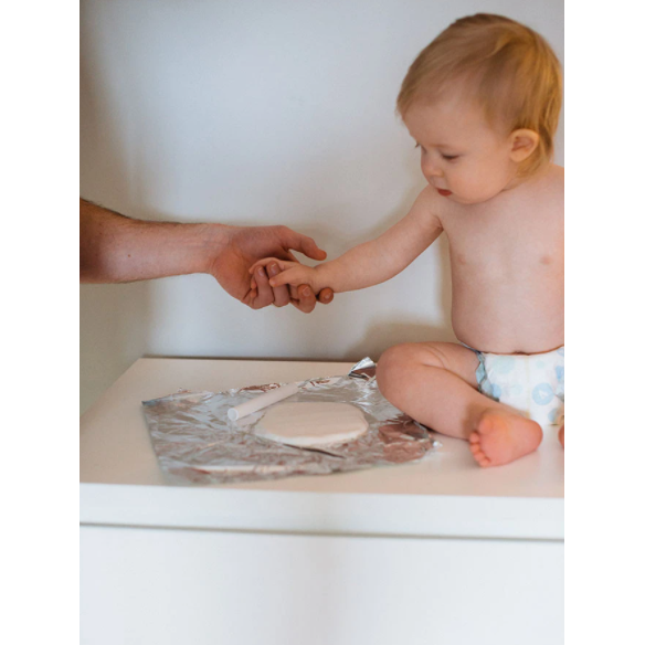 Πιέστε το χέρι ή το πόδι του μωρού σας στον πηλό απαλά αλλά αρκετά σκληρά για να δημιουργήσετε ένα σχήμα. Αν κάνετε λάθος, κανένα πρόβλημα! Μπορείτε να το ξαναφτιάχνετε όσες φορές χρειάζεται μέχρι να έχετε το τέλειο αποτέλεσμα. Μόλις έχετε το αποτύπωμά, χρησιμοποιήστε το εργαλείο διαμόρφωσης για να κάνετε έναν κύκλο και μια τρύπα για την κορδέλα. Στη συνέχεια, τραβήξτε τον πηλό που περισσεύει και αφήστε το να στεγνώσει για 1-2 ημέρες.