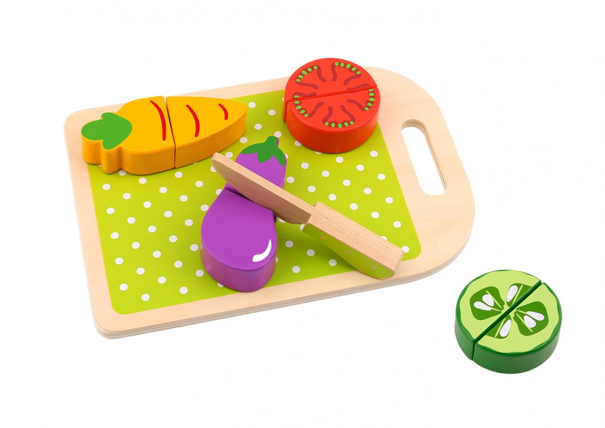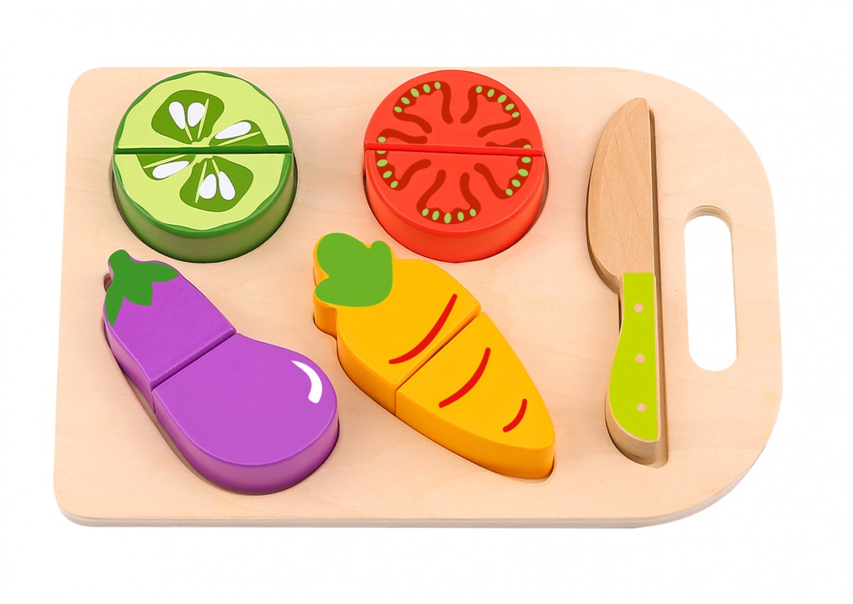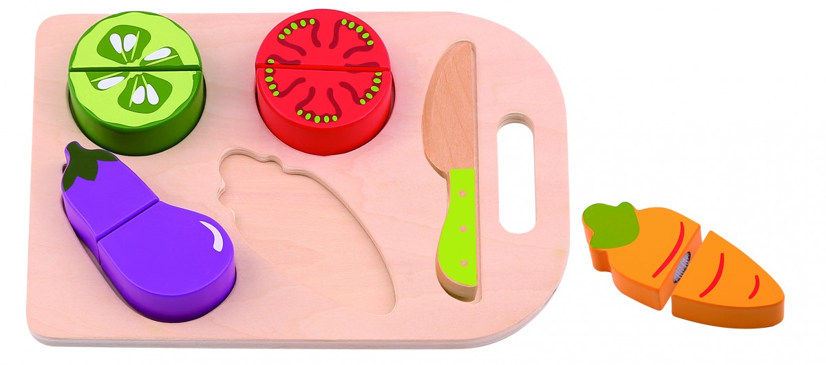 Τα ξύλινα σφηνώματα λαχανικών βοηθούν το παιδί  να εξοικειωθεί με τα λαχανικά, τα σχήματα και τα χρώματα. Χρησιμοποιώντας ένα ξύλο κοπής και ένα ξύλινο μαχαιράκι, μπορεί εύκολα και γρήγορα να κόψει τα λαχανικά μαθαίνοντας την έννοια του μισού και του ολόκληρου. Συμπεριλαμβάνεται το ξύλο κοπής, το ξύλινο μαχαιράκι κι ο δίσκος για την τοποθέτηση των λαχανικών.
