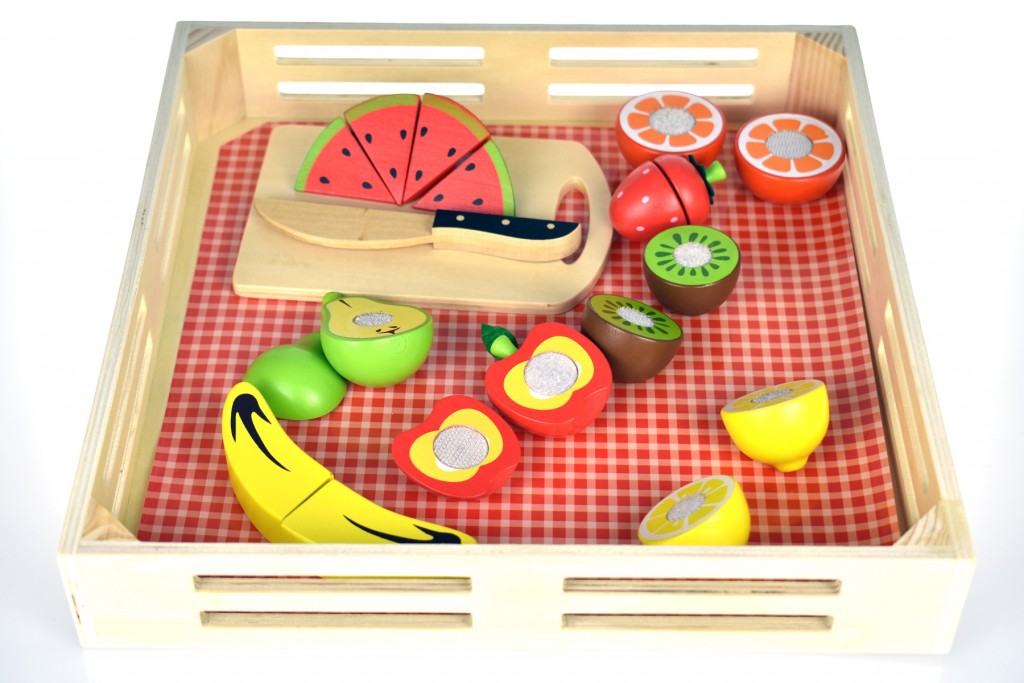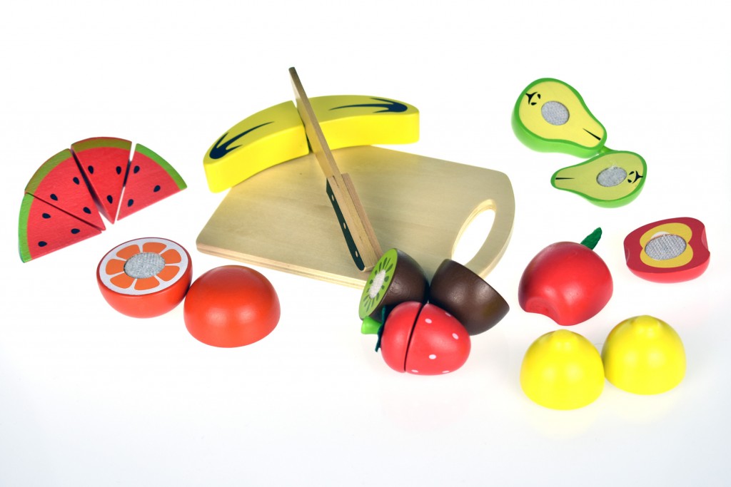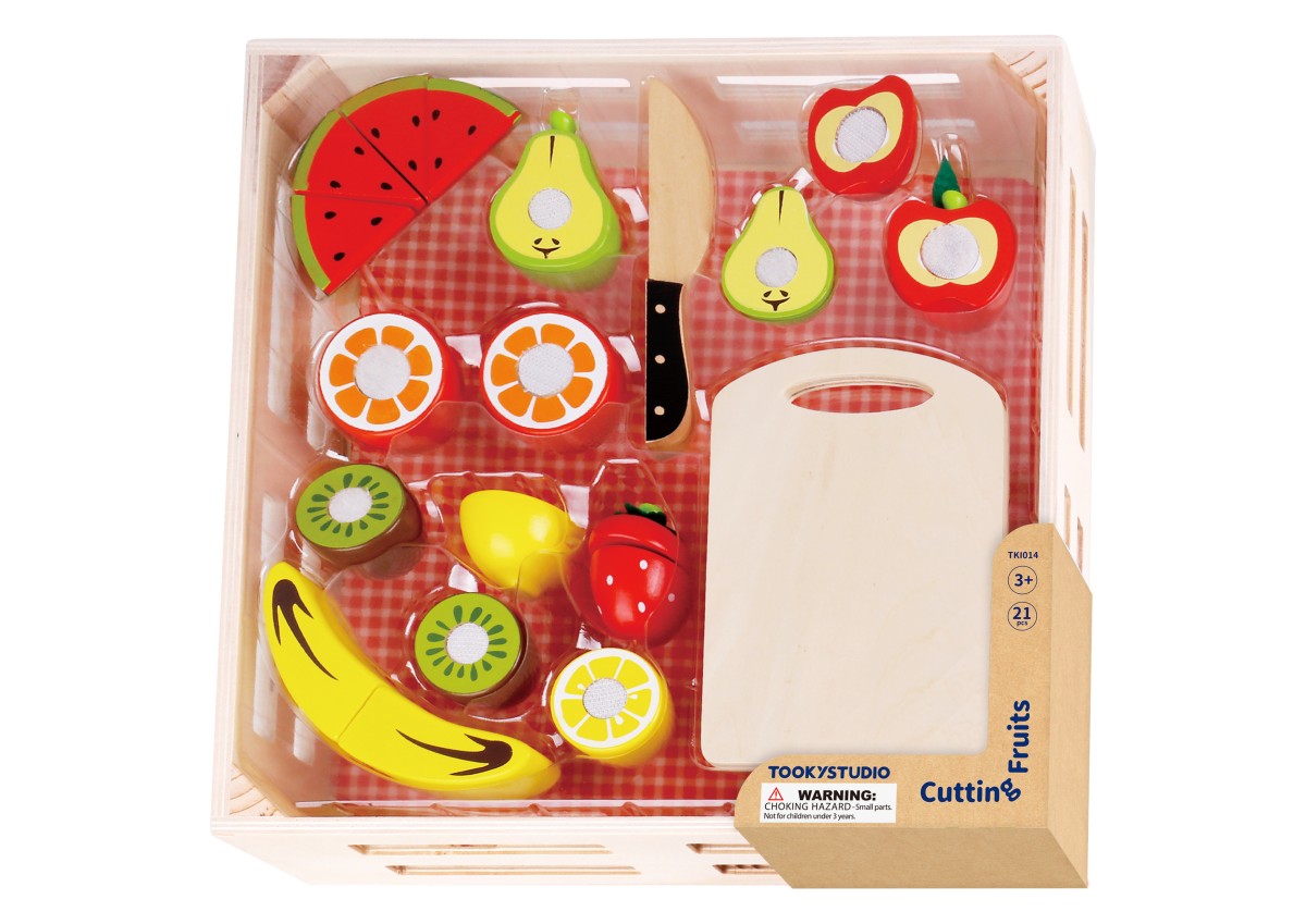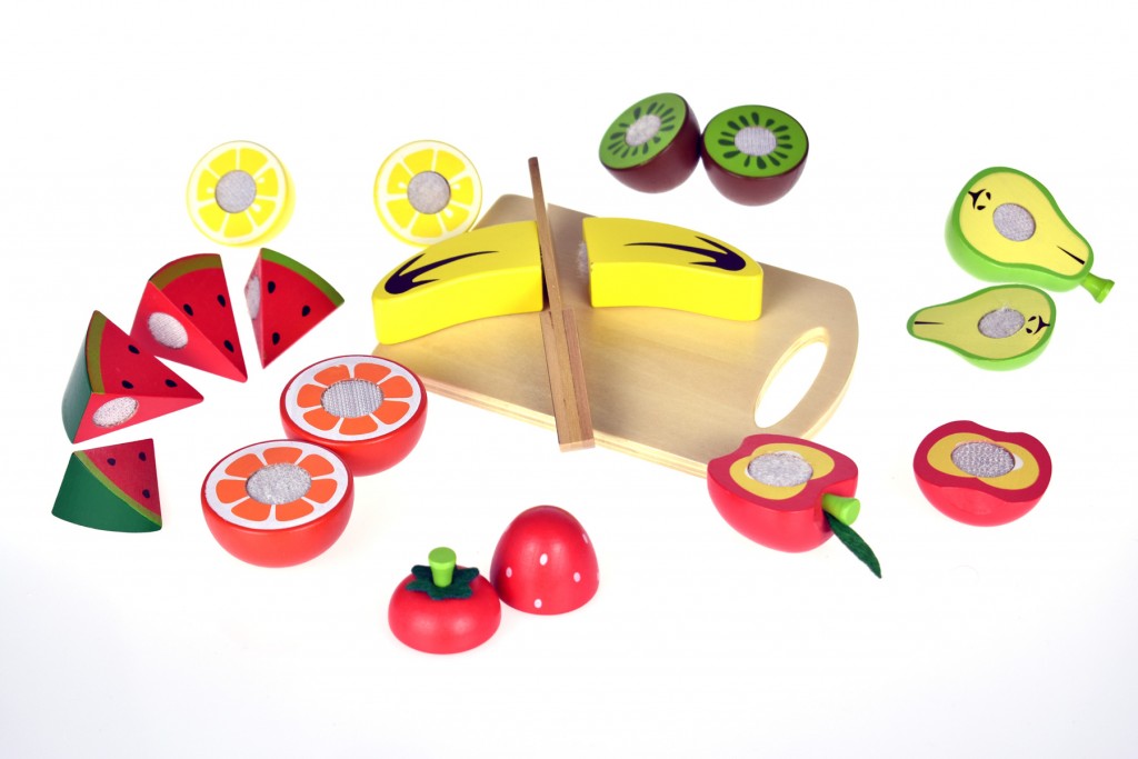 Με έντονα χρώματα και όμορφα σχέδια, το ξύλινο σετ φρούτων κοπής βοηθάει το παιδί  να εξοικειωθεί με τα φρούτα , τα σχήματα και τα χρώματα και να αναπτύξει καλύτερο συντονισμό κινήσεων. Συμπεριλαμβάνεται και ξύλο κοπής και δίσκος για την τοποθέτηση των φρούτων.