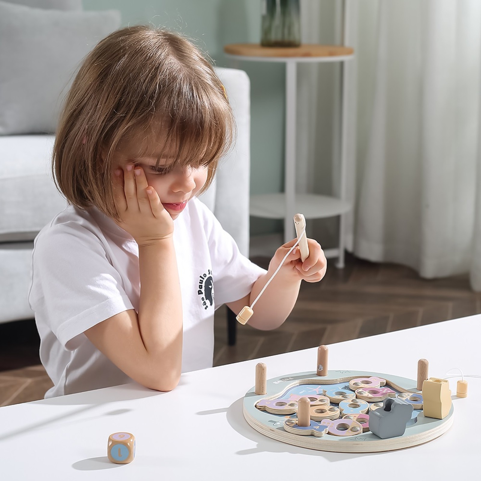 Περιλαμβάνει ξύλινη βάση λίμνης, 2 καλάμια ψαρέματος με μαγνητικές άκρες, 12 ψαράκια με χρώματα και αριθμούς για αλίευση, καθώς και ένα ζάρι για να προσθέσετε στην πρόκληση!